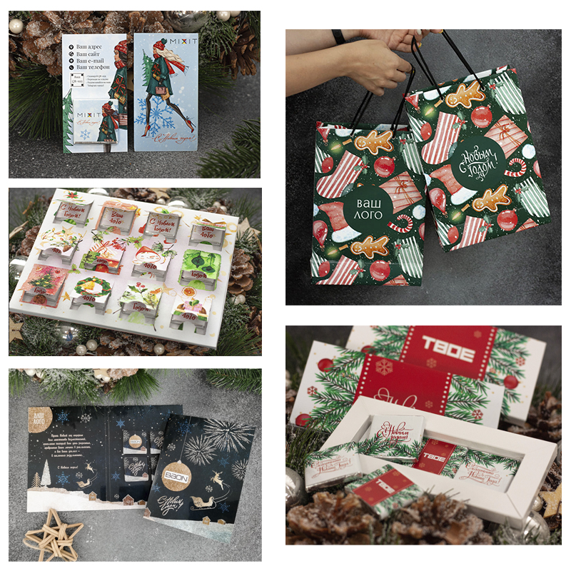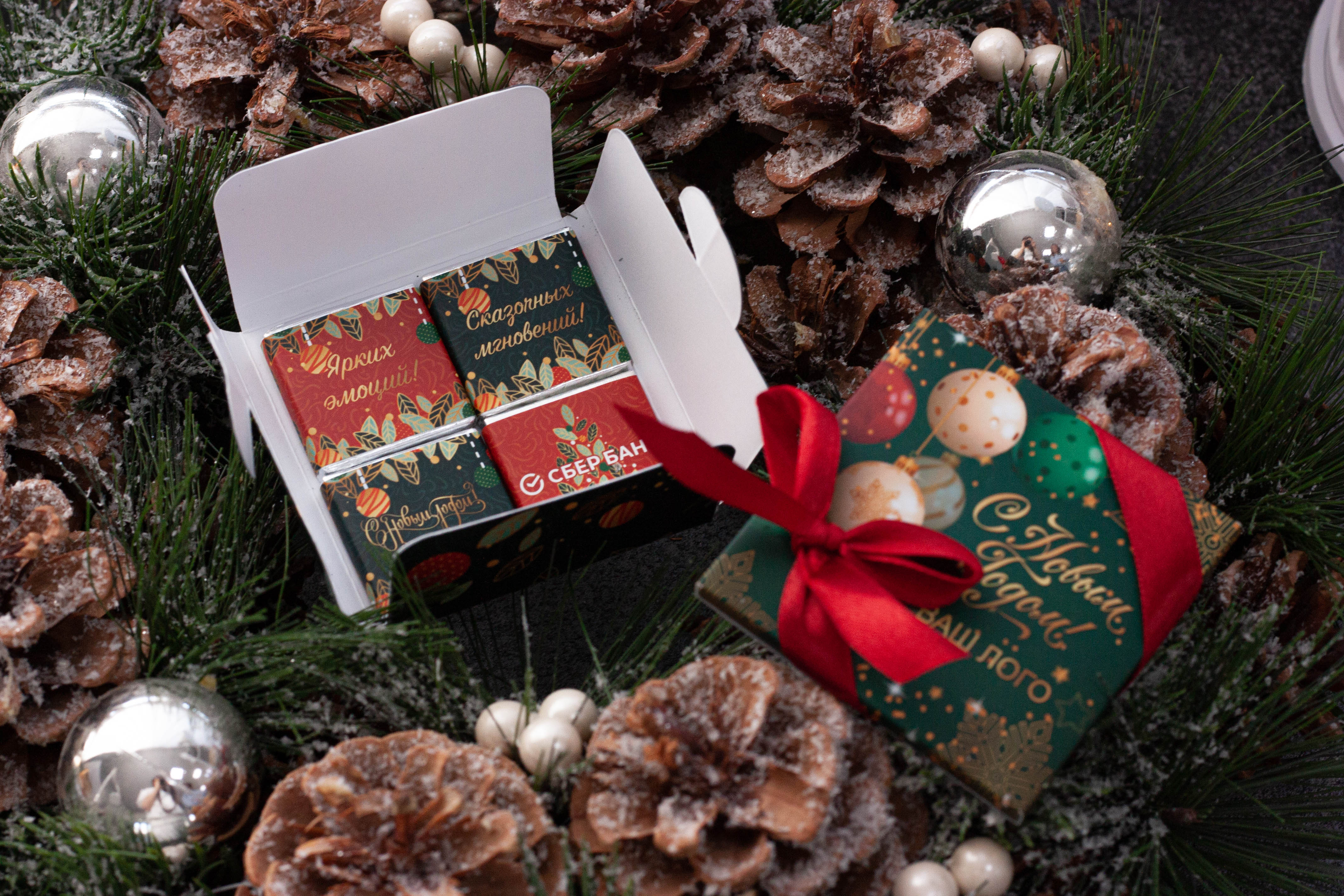 В качестве симпатичного дополнения к основному подарку, можно использовать комплимент. Это 4 плитки шоколада, весом в 5 грамм, завернутые в небольшой конверт размером 72х72х7мм с любым изображением по Вашему пожеланию. Для тех, кто решил порадовать сотрудников фирменной продукцией, идеальным выбором подарка станет сертификат с логотипом кампании или новогодним изображением. Помимо основной информации, он будет содержать внутри маленькие плитки шоколада.