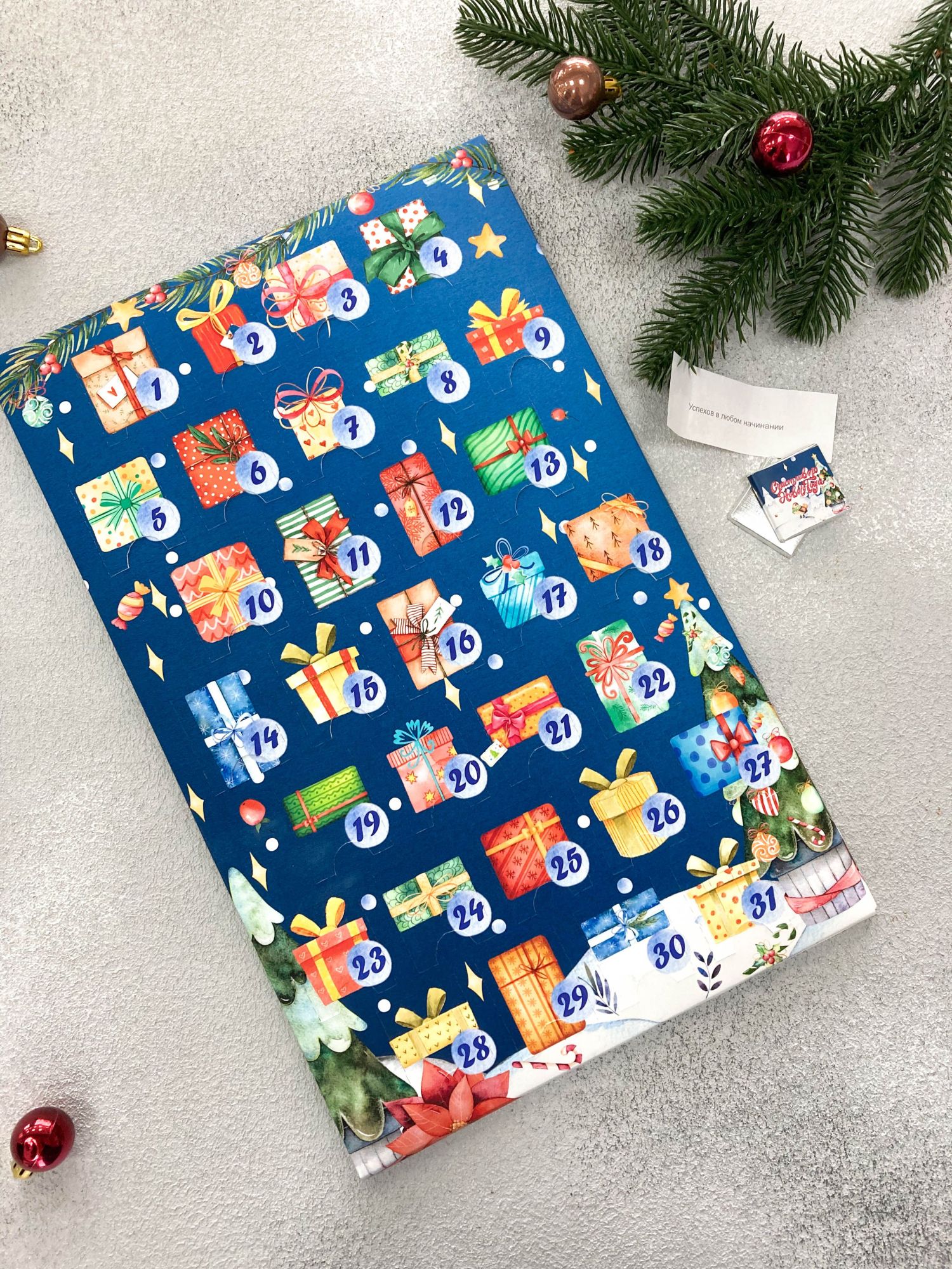 Большой адвент - это плоская коробка с 31 окошком на каждый день месяца. А вмаленьком адвенте 12 окошек на каждый месяц в году. Дизайн коробки может быть изготовлен на заказ с вашим логотипом и в вашем фирменном стиле.