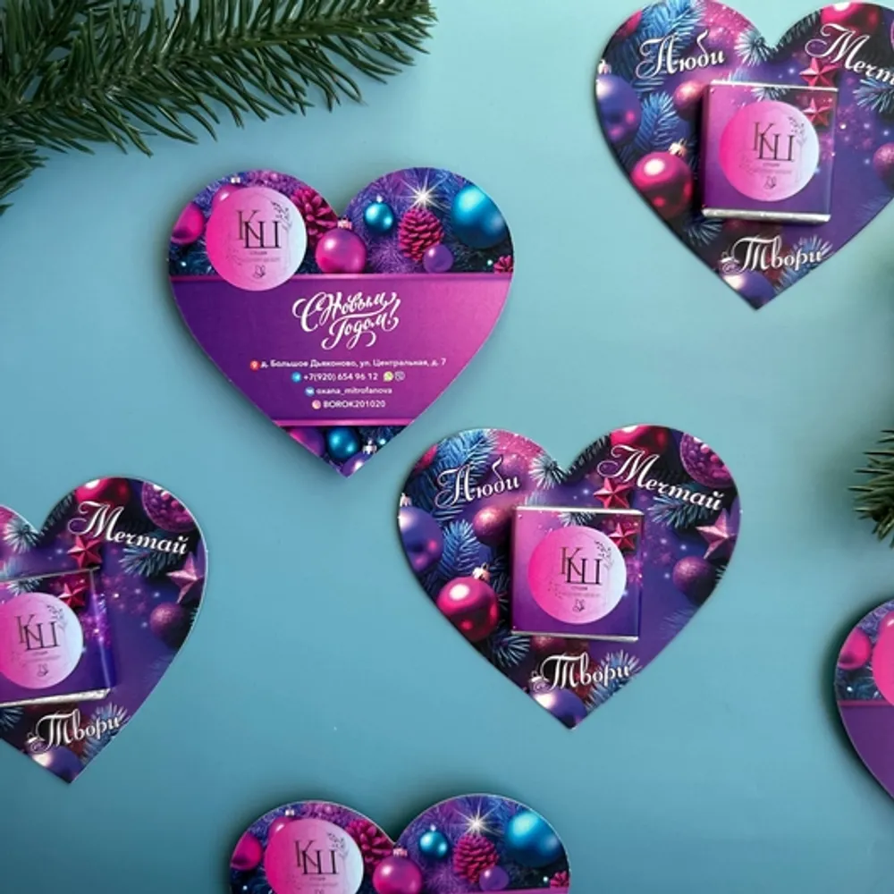 Открытка "Новогодняя" в виде сердца с шоколадкой 5гр -Дизайном 2025г и логотипом