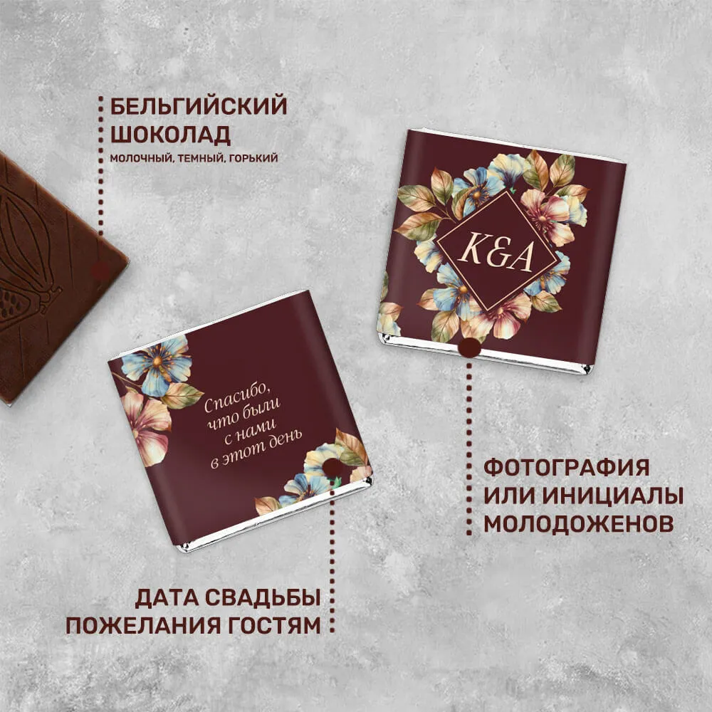 Очень вкусный свадебный 5гр шоколад, бонбоньерка. На упаковке: инициалы молодоженов, текст благодарности. Цвета: бордовый, желтый, зеленый, голубой, белый, красный